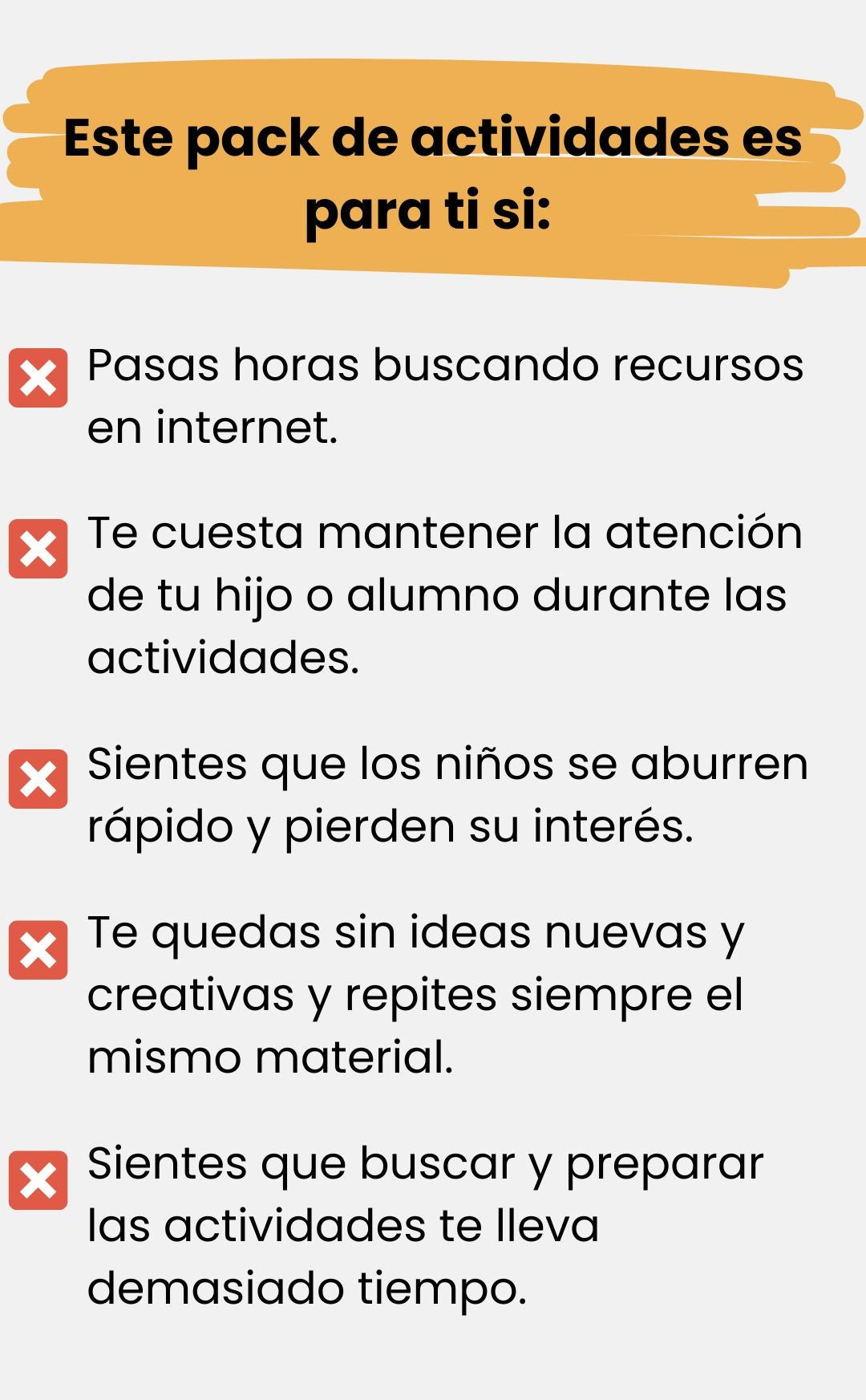 Las actividades están diseñadas para niños de 3 a 9 años, adaptables según el nivel de desarrollo de cada uno. Excepto las actividades Montessori que son a partir los primeros meses.