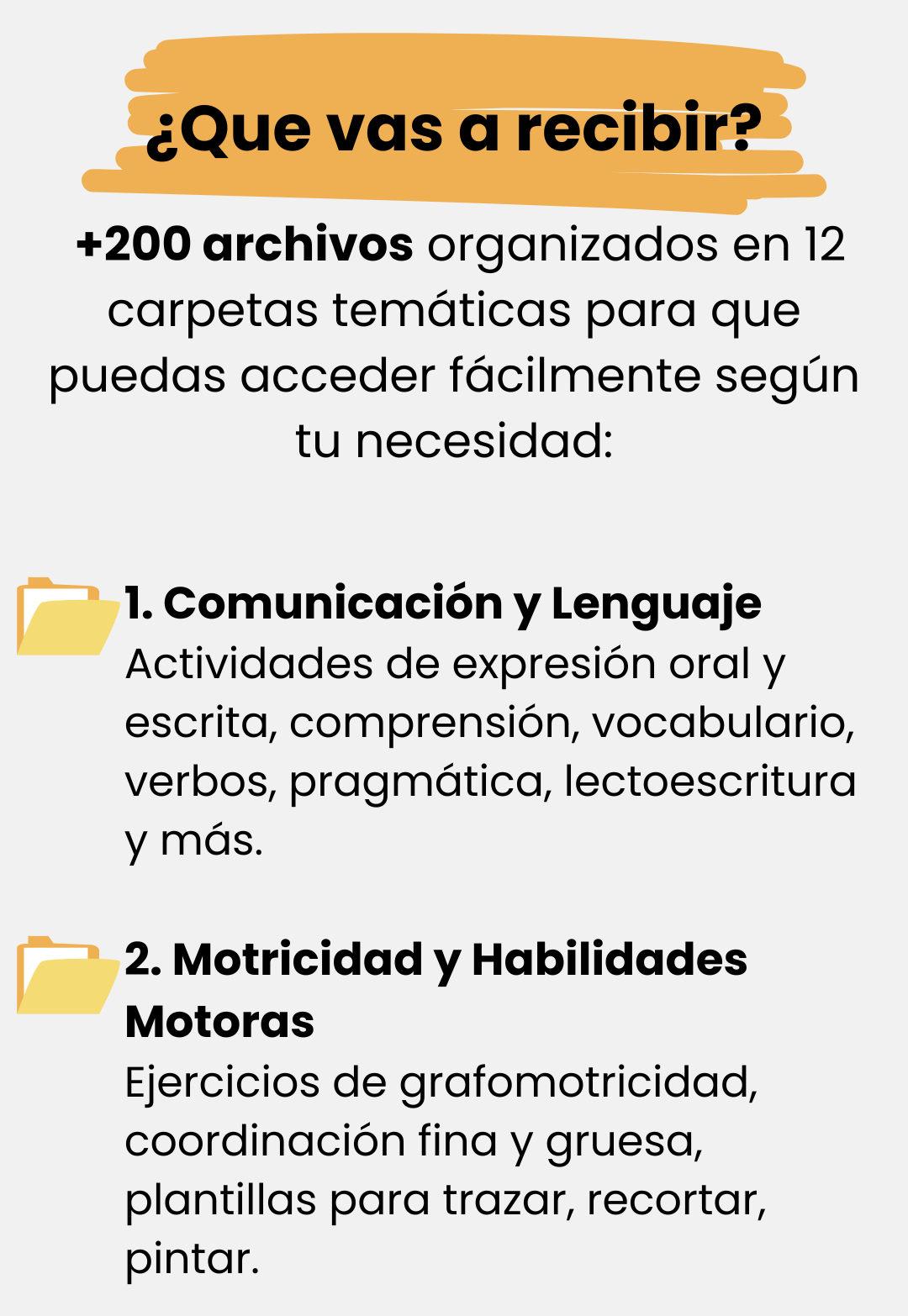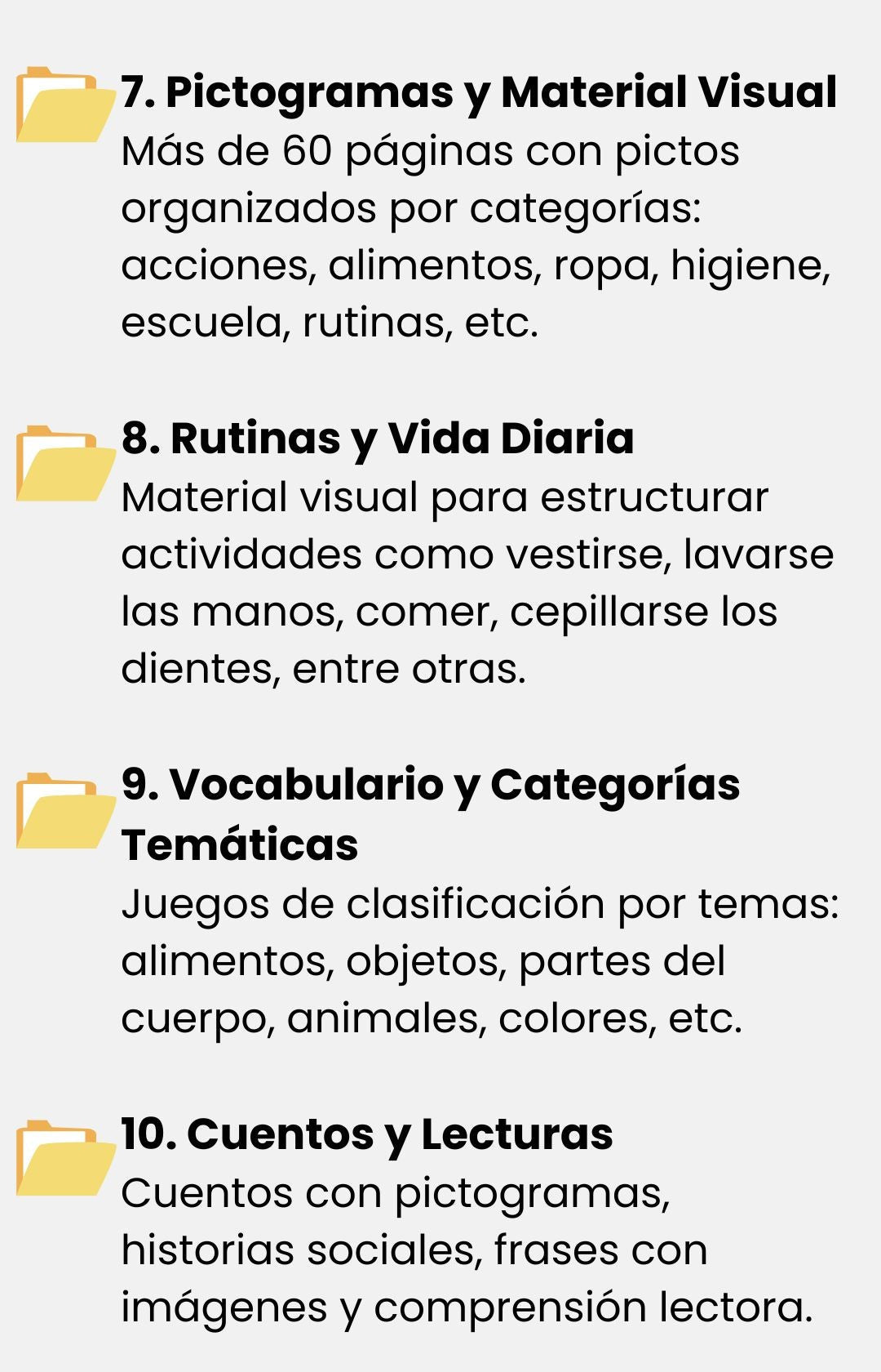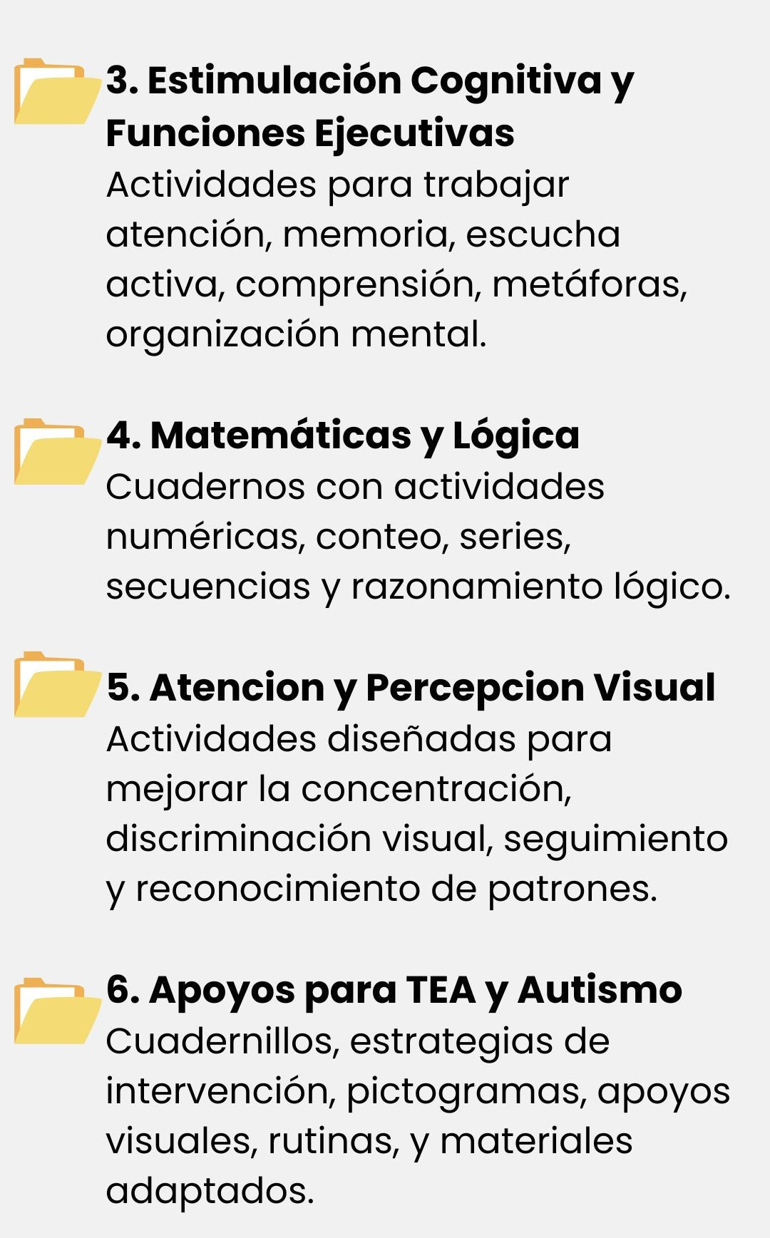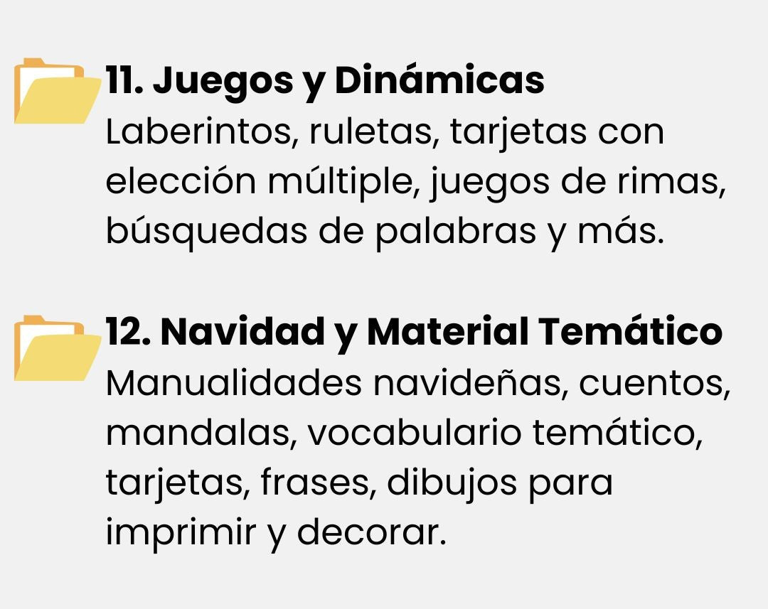 Incluye más de 100 archivos PDF listos para usar: fichas, pictogramas, cuentos, juegos y actividades imprimibles, organizados por temas para estimular la atención, la motricidad, la lectoescritura y habilidades cognitivas.