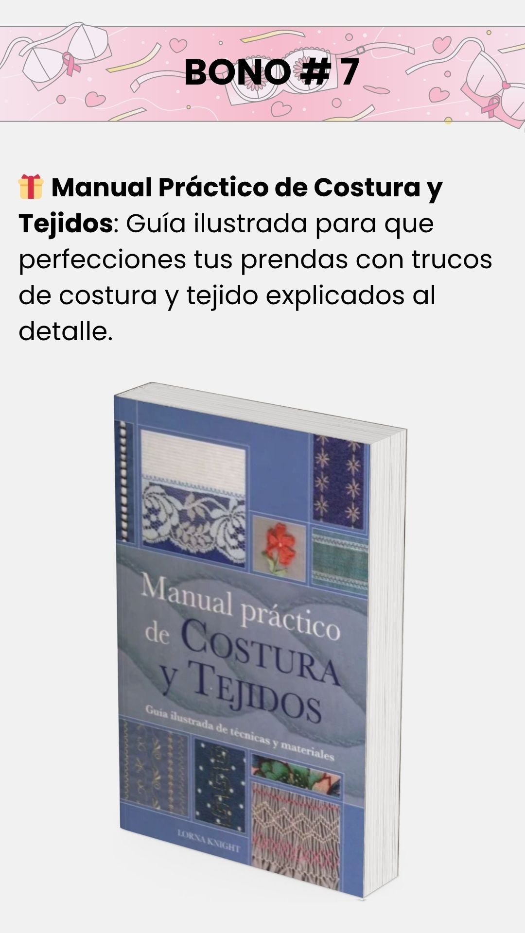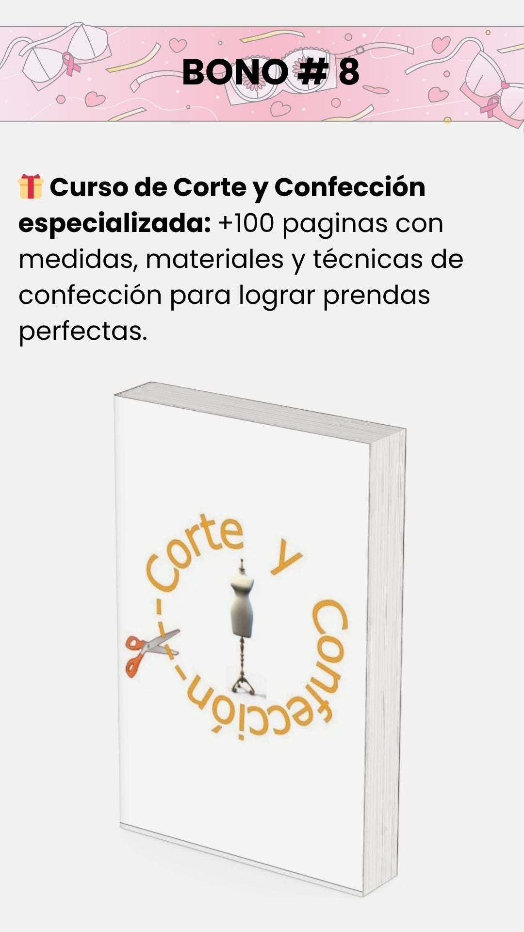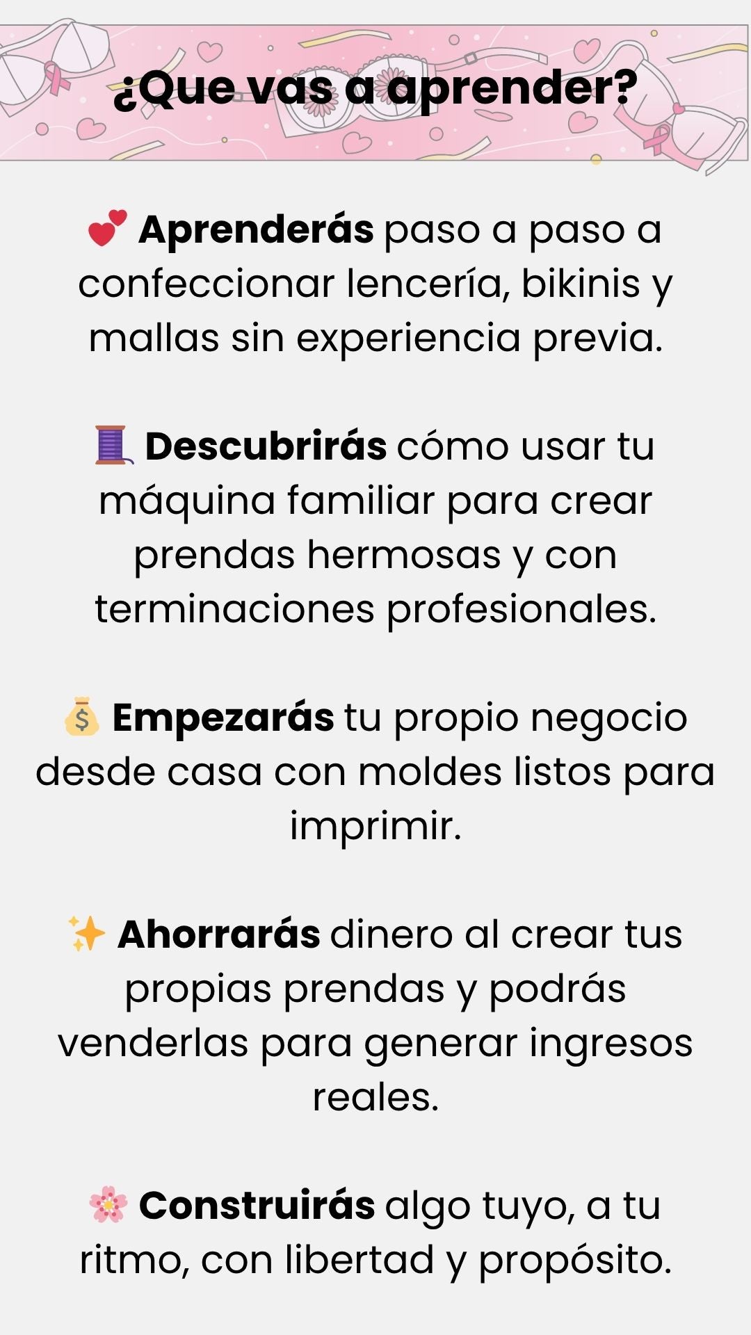 Un completo curso digital de lencería, bikinis y corsets con contenido práctico, ideal para aprender, practicar y vender. Incluye: